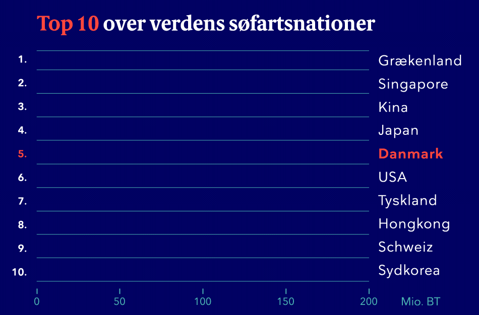 Den positive udvikling betød, at Danmark nu har passeret USA som verdens femtestørste søfartsnation målt på alle de skibe (BT) på både dansk og udenlandsk flag, som danske rederier opererer. Ser man alene på handelsflåden under dansk flag er Danmark nummer 12 på verdensranglisten (BT).