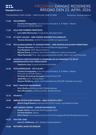 Under temaet “Forandring som vilkår – omstilling som styrke” sætter vi fokus på ledelse i en verden i opbrud, global handel, sikkerhed, beredskab og søfartens rolle i Danmark og internationalt. Dagen byder på oplæg, samtaler og paneldebatter.
